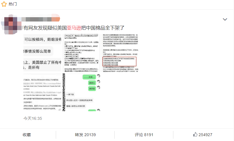 爆料人在第一张截图中控诉:“亚马逊上,美国禁止了所有中国棉制品,是所有。”并附上了上文卖家邮件截图及美国海关禁止进口新疆所有棉花产品的通知,网友们出离愤怒。