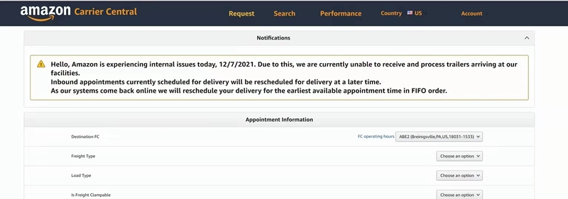 Hello,Amazon is experiencinginter nal issues today,12/7/2021.Due to this, we are currently unable to receive and process trail ers arriving at our facilities.
