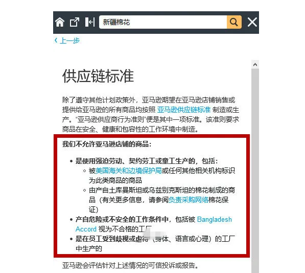 有卖家在亚马逊后台找到了相关供应链标准,不允许亚马逊店铺销售的商品中提到——“是使用强迫劳动、契约劳工或童工生产的,包括被美国海关和边境保护局或任何其他相关机构标识为此类商品的商品”: