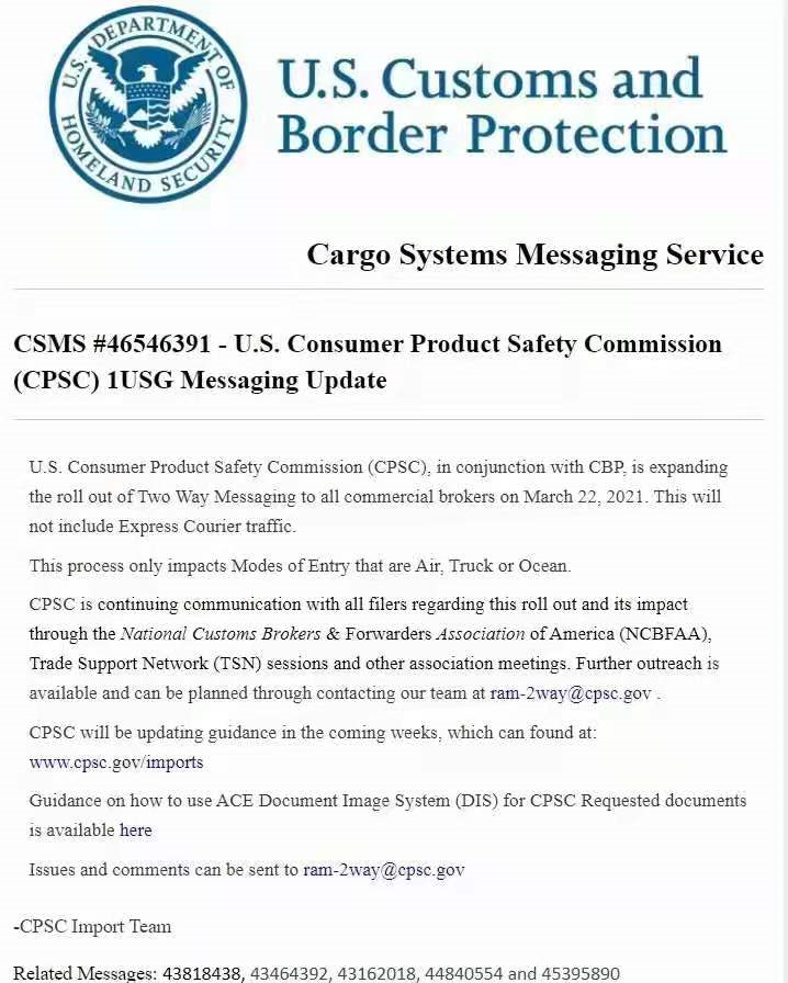 重要通知:接到美国清关行的最新消息,美国CPSC从2021/03/22开始改革,开始electronically review entry,凡是他们管辖范围内的产品,都会被标记审查,如有相关产品请提前准备好相关文件比如CPC检测报告、认证等等,以备目的港海关审查。