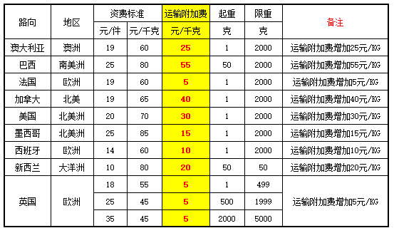 在上述调整基础上,对美国,澳大利亚2个路向额外 加收附加费(每500克加收20元):对加拿大加收附加费(每 500克加收10元)